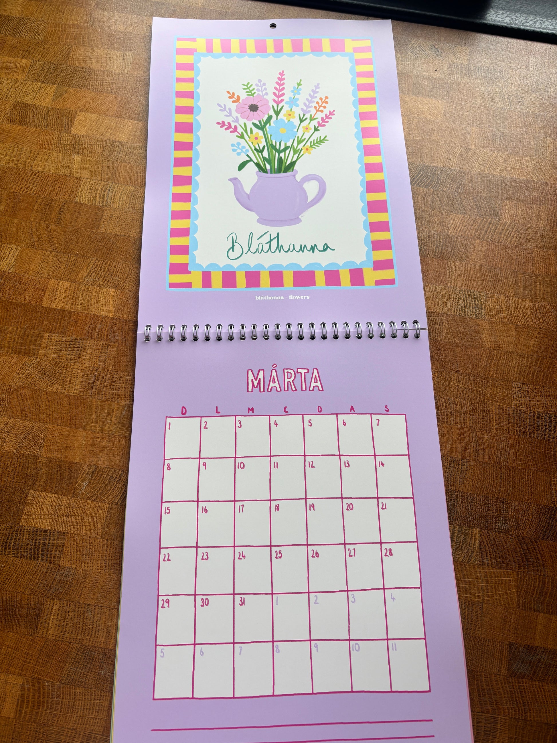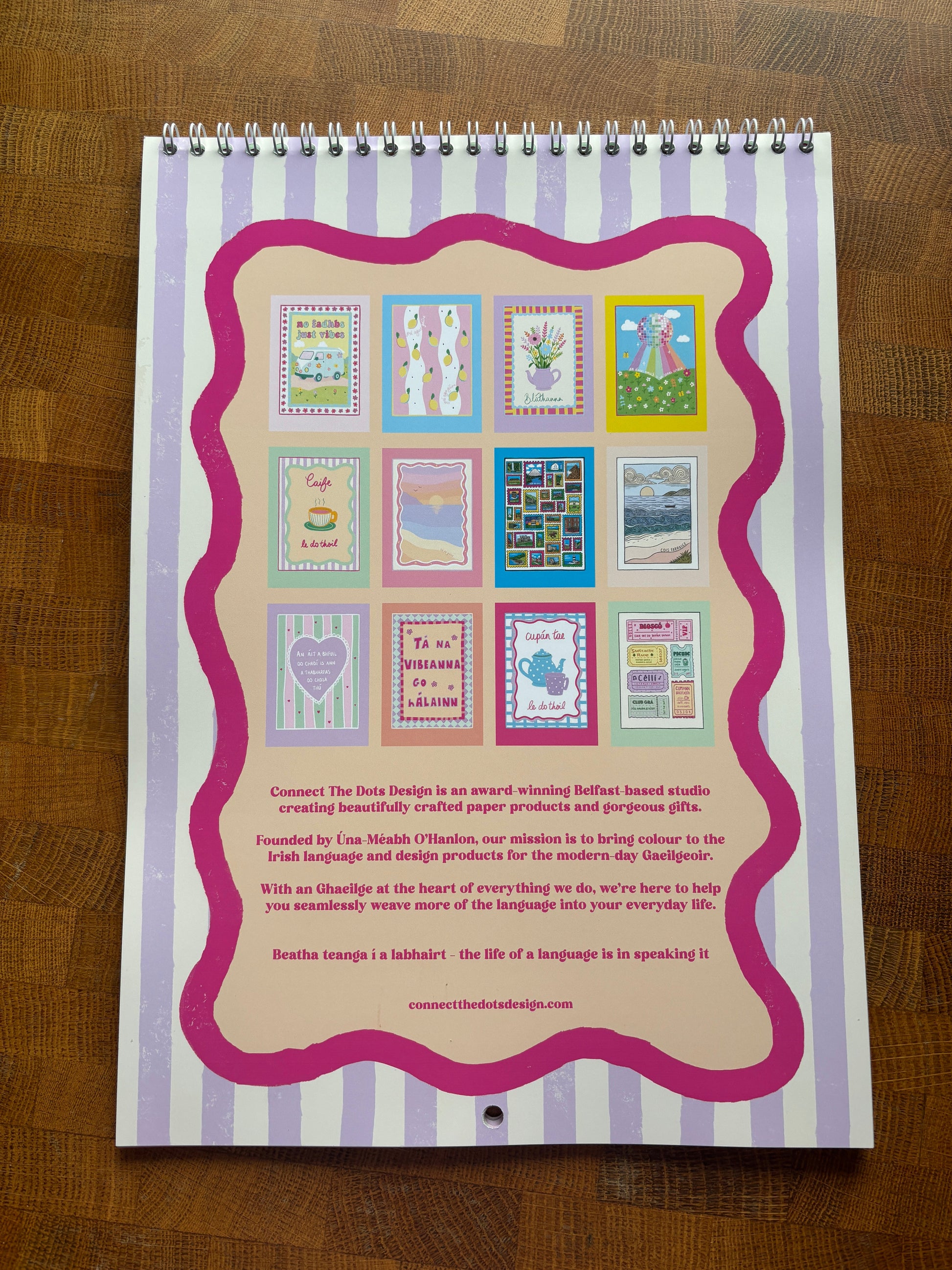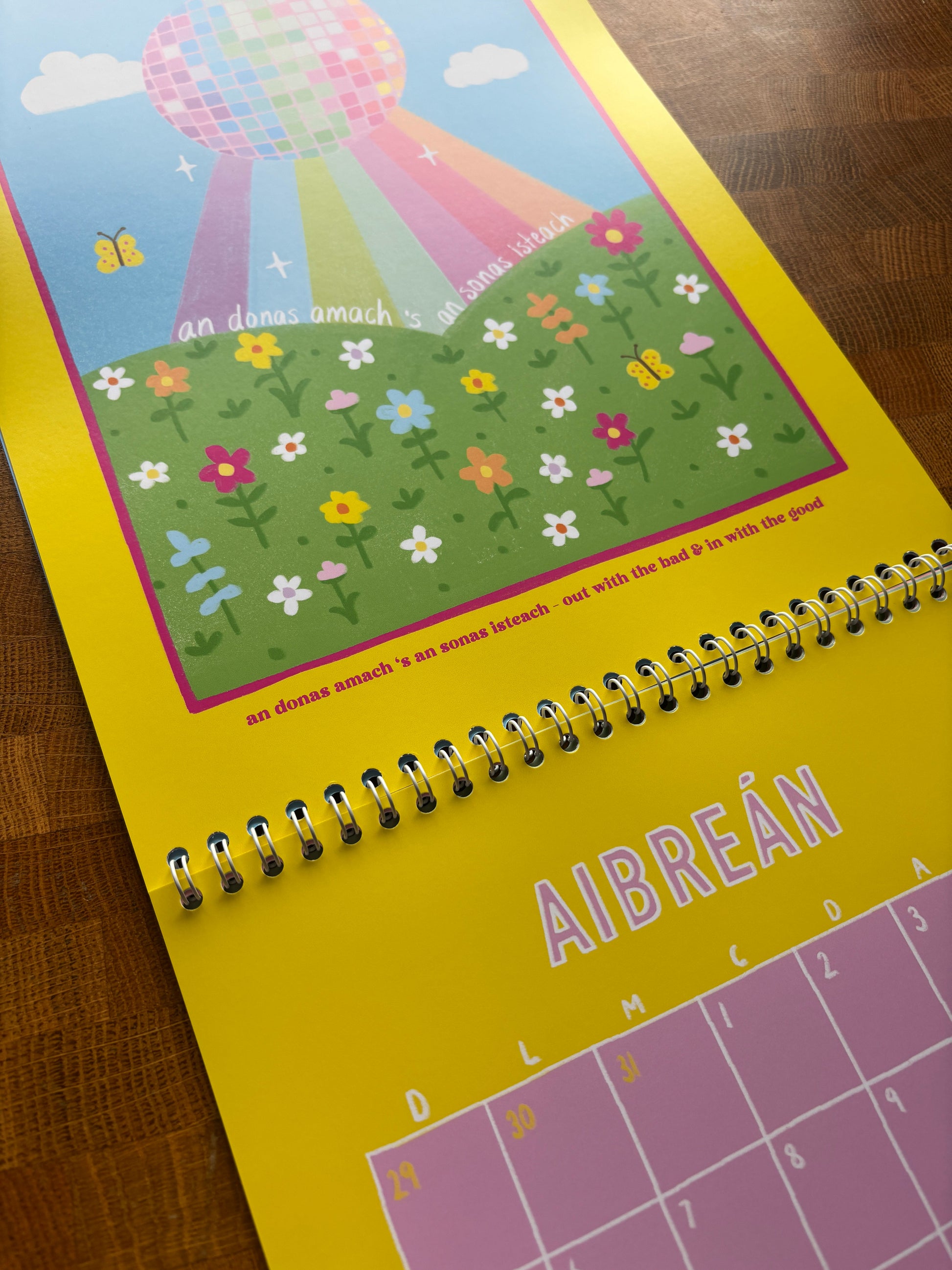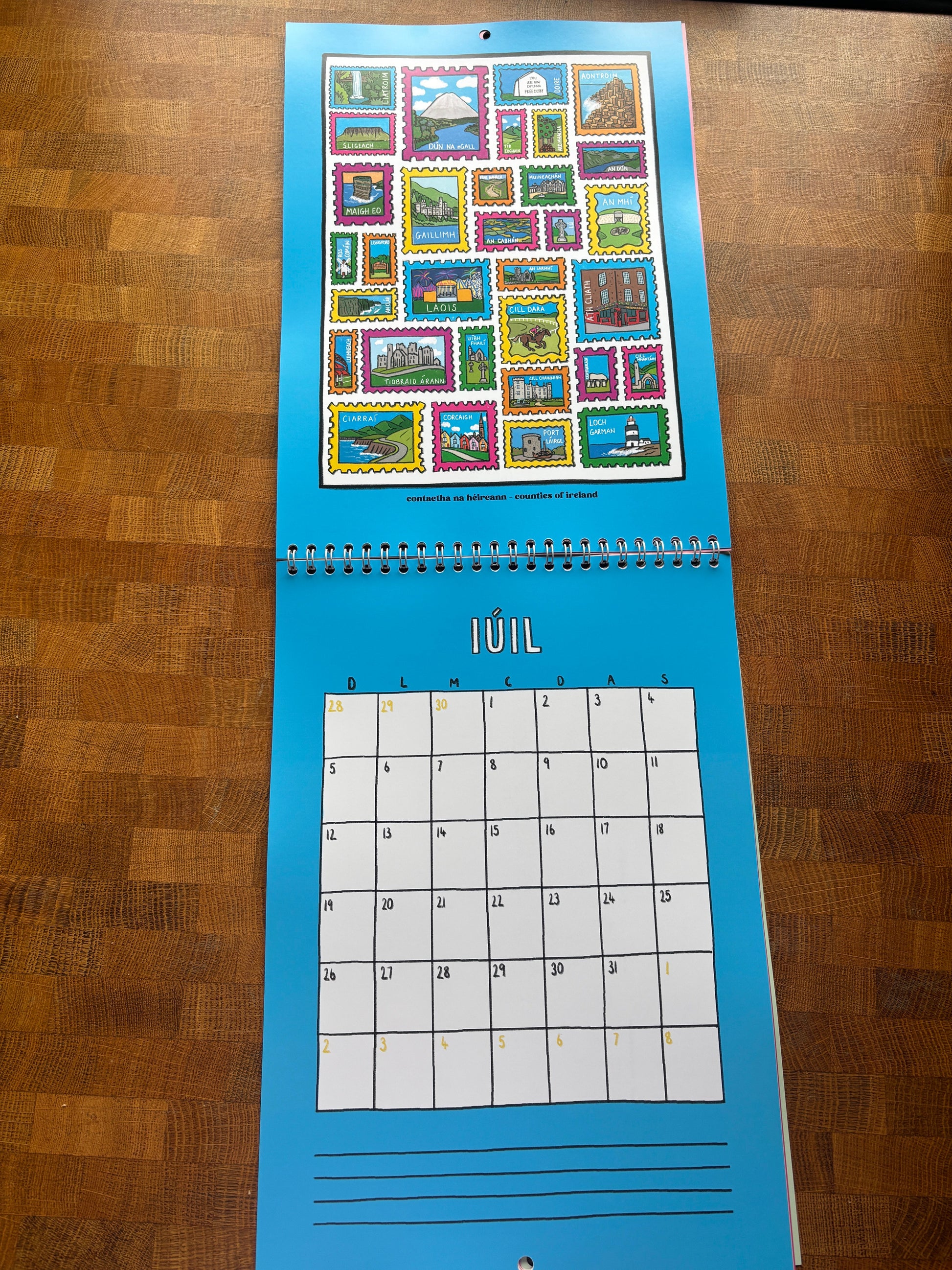It’s A4, wire-bound and printed on lovely luxury silky paper. The months are in Irish and each illustration has an English translations underneath so everyone can follow along.