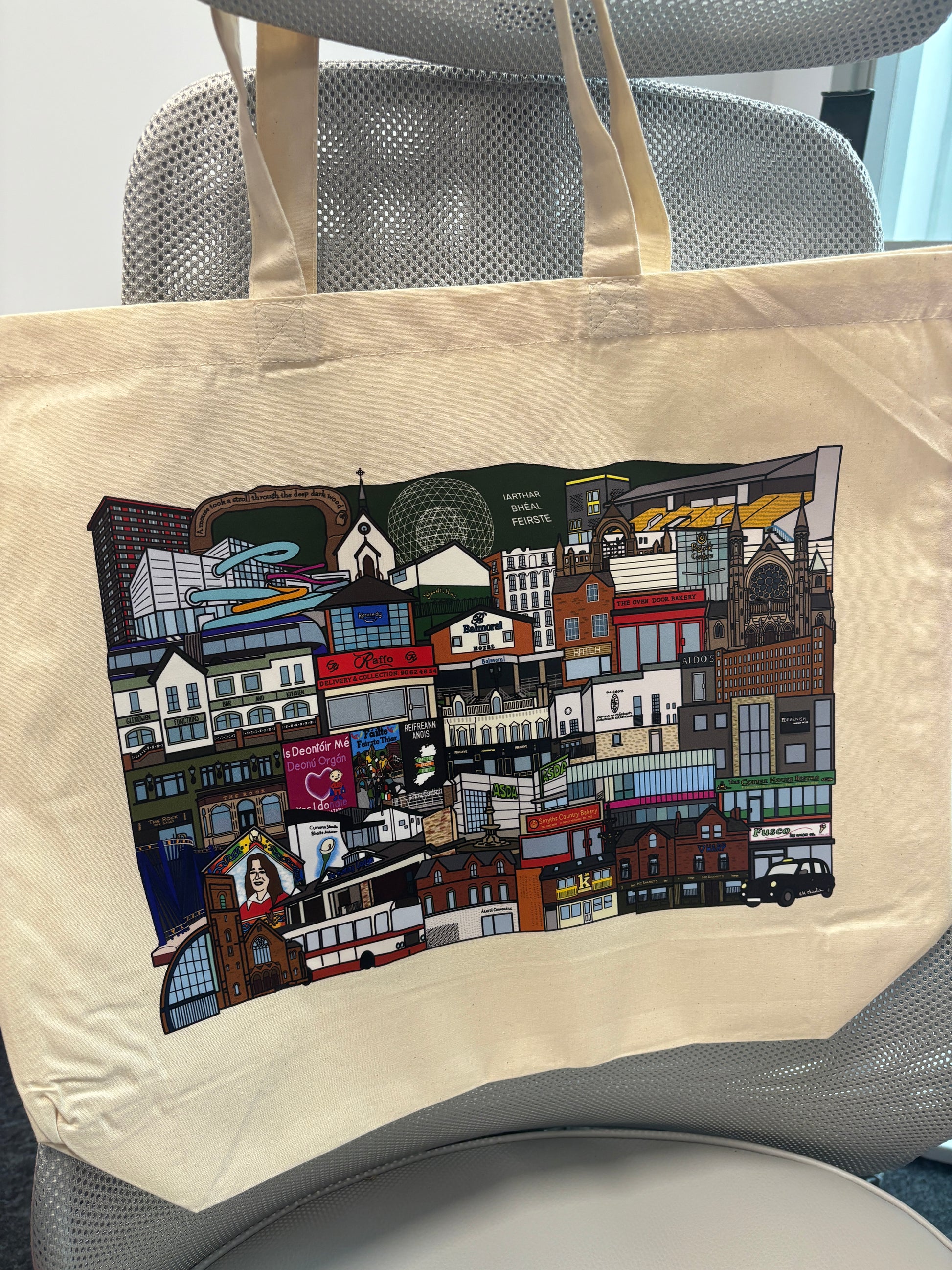 Featuring many of the most well known landmarks of West Belfast this toe bag is one of a kind.