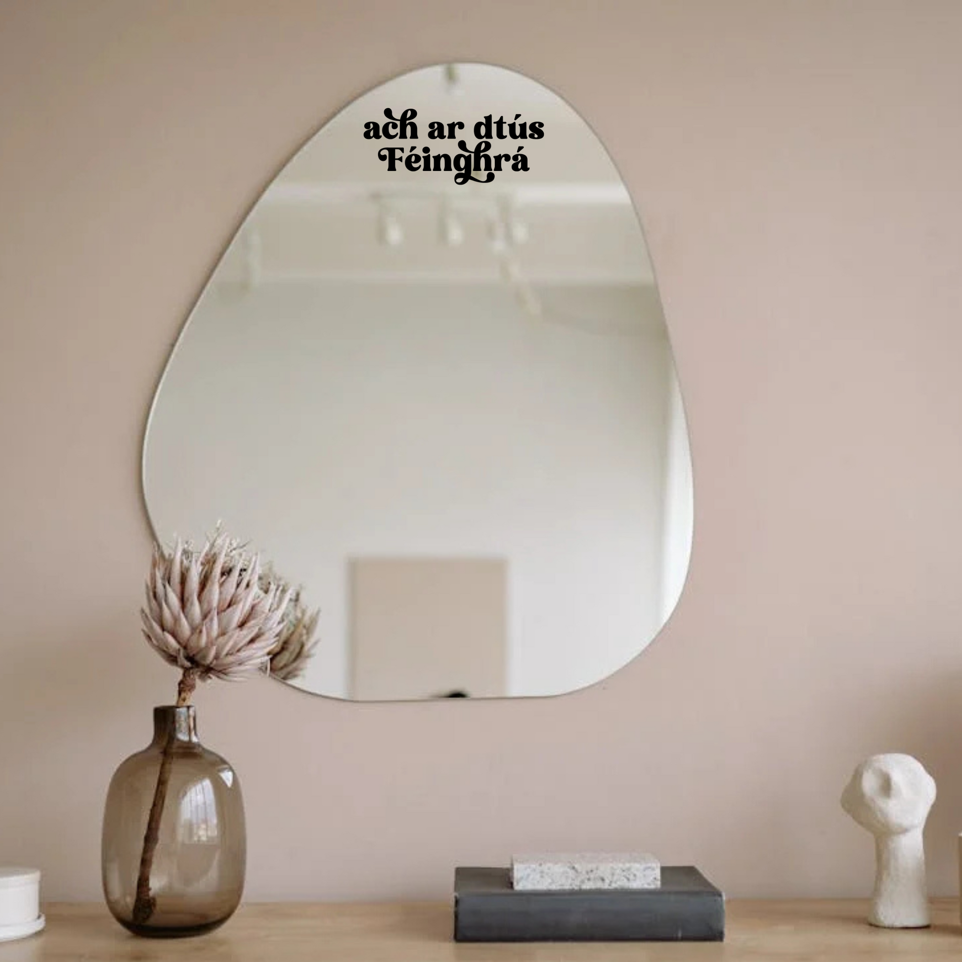 A gentle reminder to prioritise yourself. Our Ach ar Dtús, Féinghrá mirror decal brings the beauty of Irish language and the power of self-care together in one design. Perfect for mirrors, windows, and other flat surfaces.