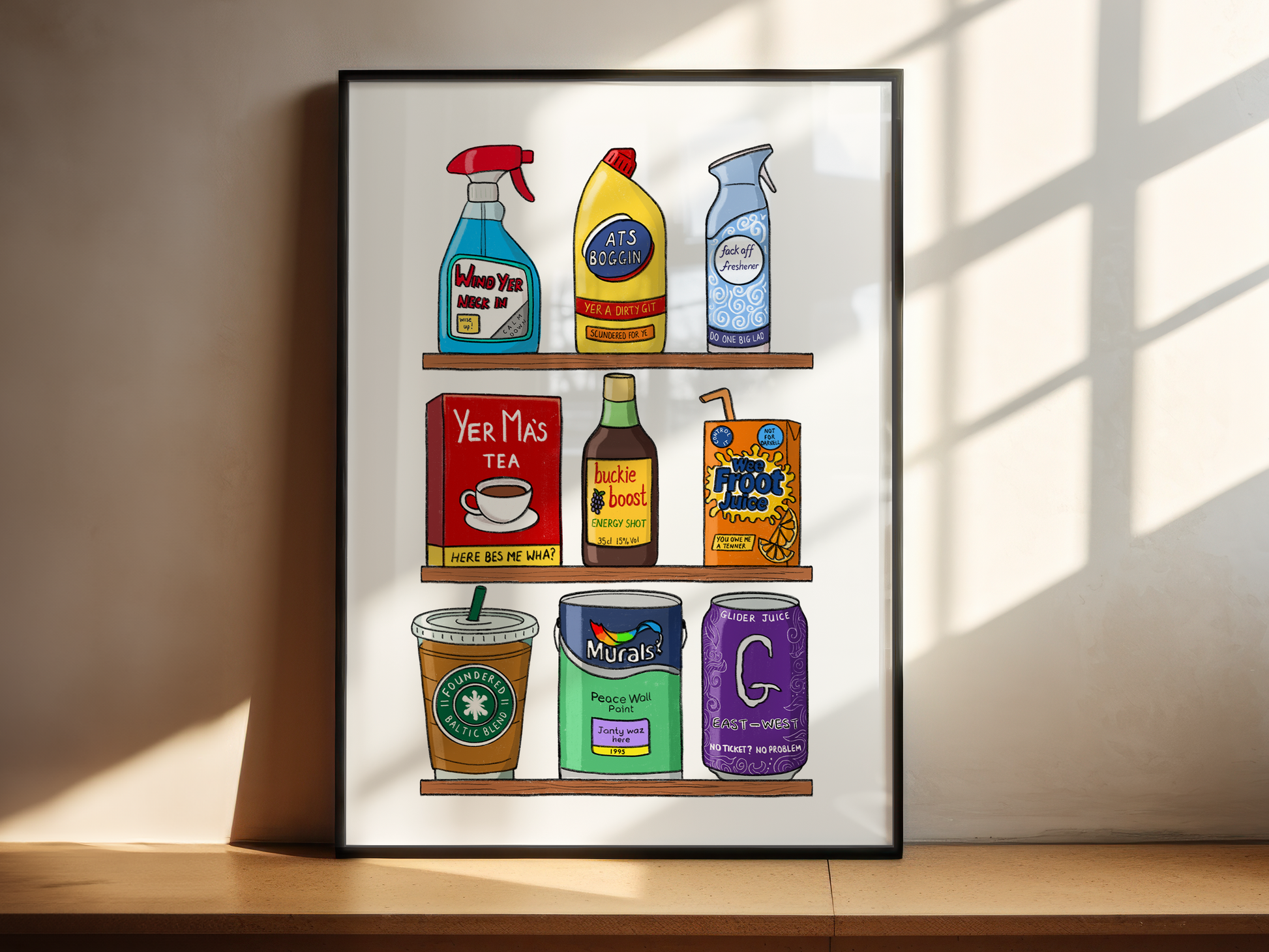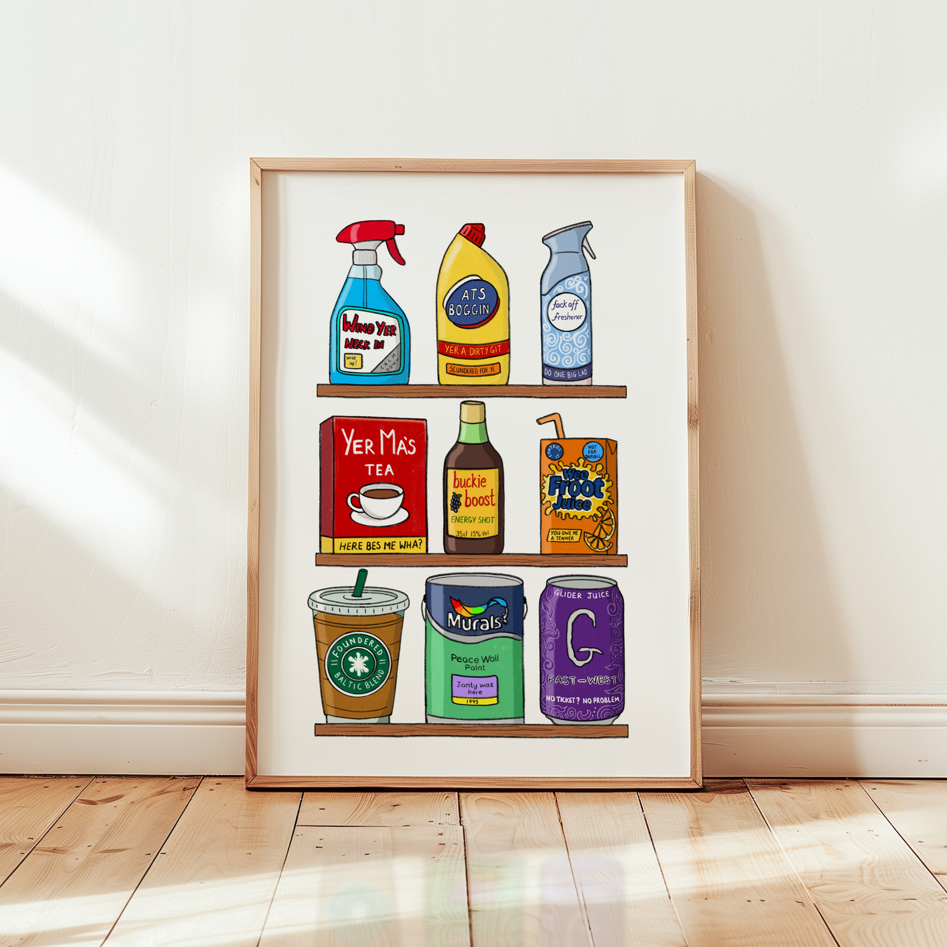 A bold, colourful print featuring illustrated bottles and cartons based on classic household staples, reimagined with a nod to Belfast’s humour, personality and character.