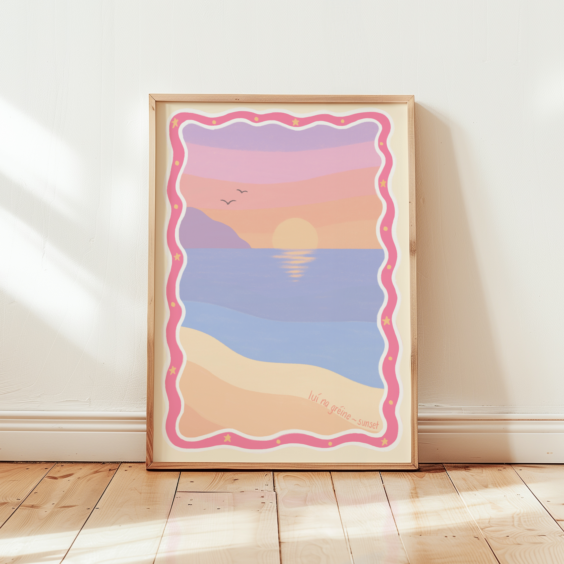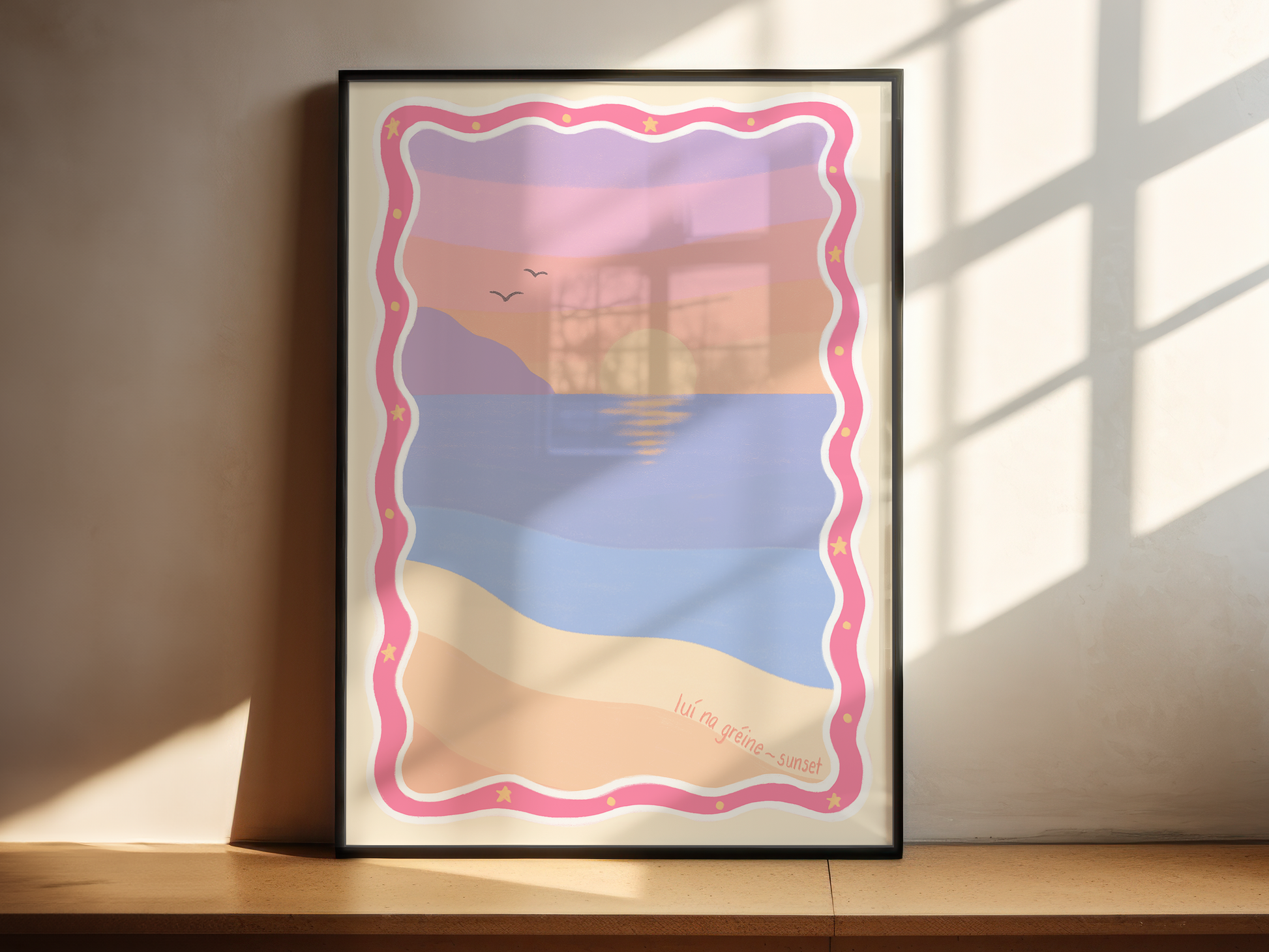 Luí na gréine means sunset and this pretty pastel print captures those quiet, golden moments by the sea and the gorgeous summer evening vibes.