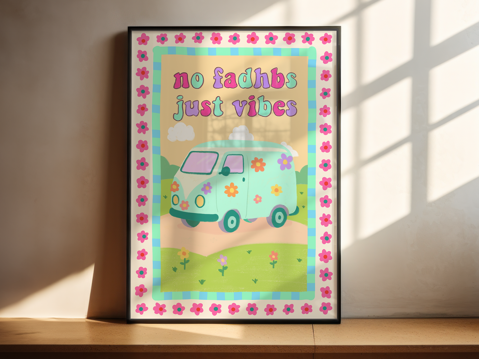 A pretty pastel-toned print featuring a retro camper van, groovy flowers and the feel-good phrase No Fadhbs Just Vibes. It's fun mix of Irish and all the good energy.
